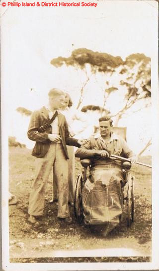 Ted Jenkins with friends out shooting rabbits. Although Ted had been confined to a wheelchair after a diving accident aged 16 he was a crack shot. Circa 1950. Photo: Arthur Evan collection.