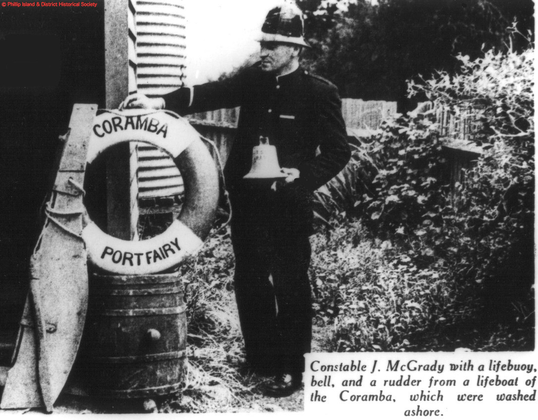 Policeman McGrady and the bell from the Coramba. Photo from Des Williams