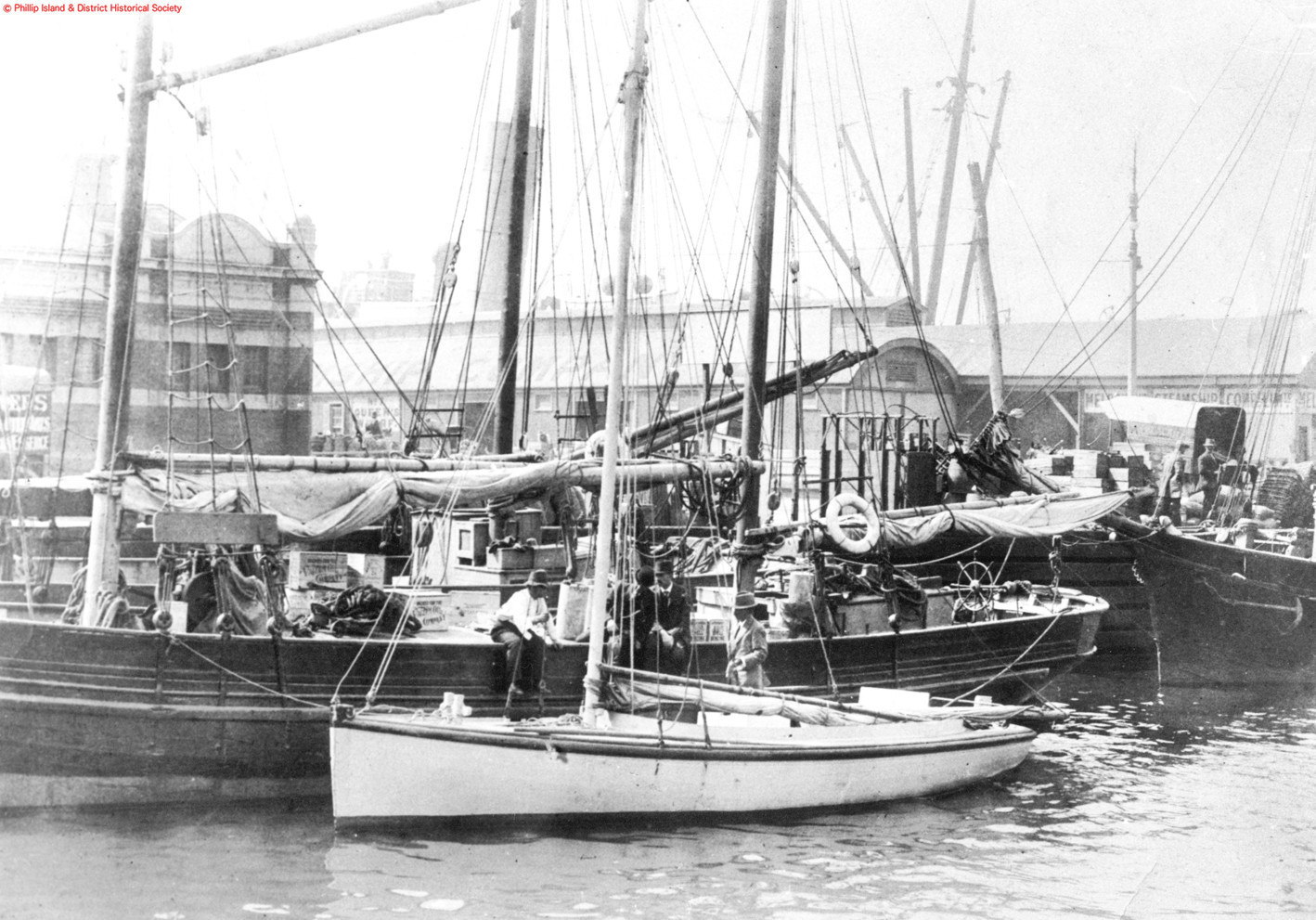 Fishing boat Ida tied up alongside Vision at Little Dock c. 1915. Ida was a couta boat.