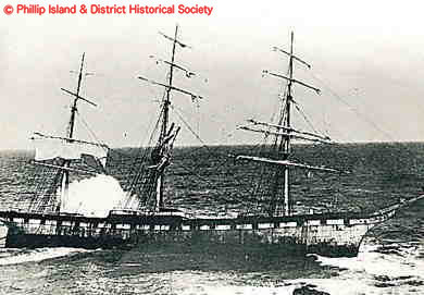 The Speke wrecked near Kitty Miller Bay on Phillip Island's south coast, 22 Feb 1906. A small part of the hull is still visible on the beach. Photo 23 Feb 1906.