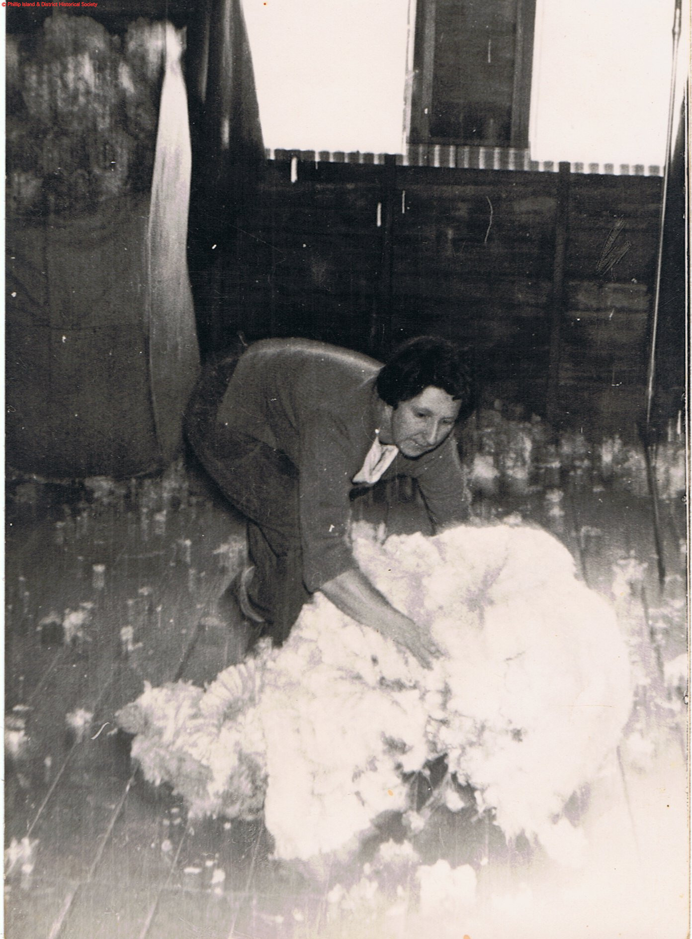 Molly Jeffrey picking up fleece during shearing time, circa 1960. Ventnor, Phillip Island. Photo: Molly Jeffrey collection