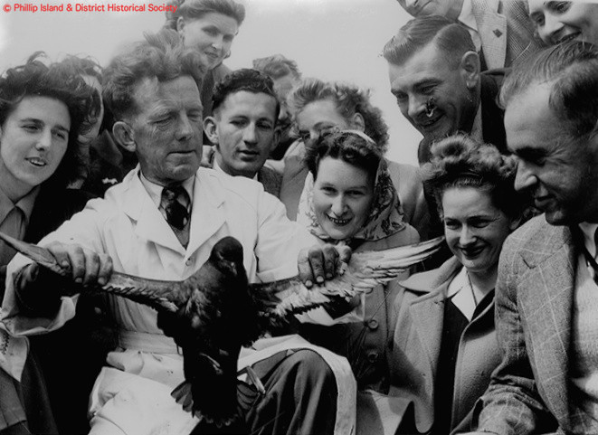Bert West and mutton bird (short tailed shearwater) with tourists, c.1945. PIDHS collection