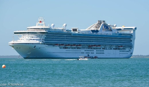 Recently we stayed open all day Saturday to cater for passengers from the Golden Princess cruise ship which came into port on the way home from a five day cruise on the east coast of Tasmania. The museum had about 50 visitors, all of whom enjoyed their visit. Thanks to Bruce, Christine, Judy Gittus and Julie who were rostered on during the day to keep the museum open from 10 a.m. until 6 p.m. Photo by Lisa Schonberg shows the Golden Princess anchored off Cowes jetty.
